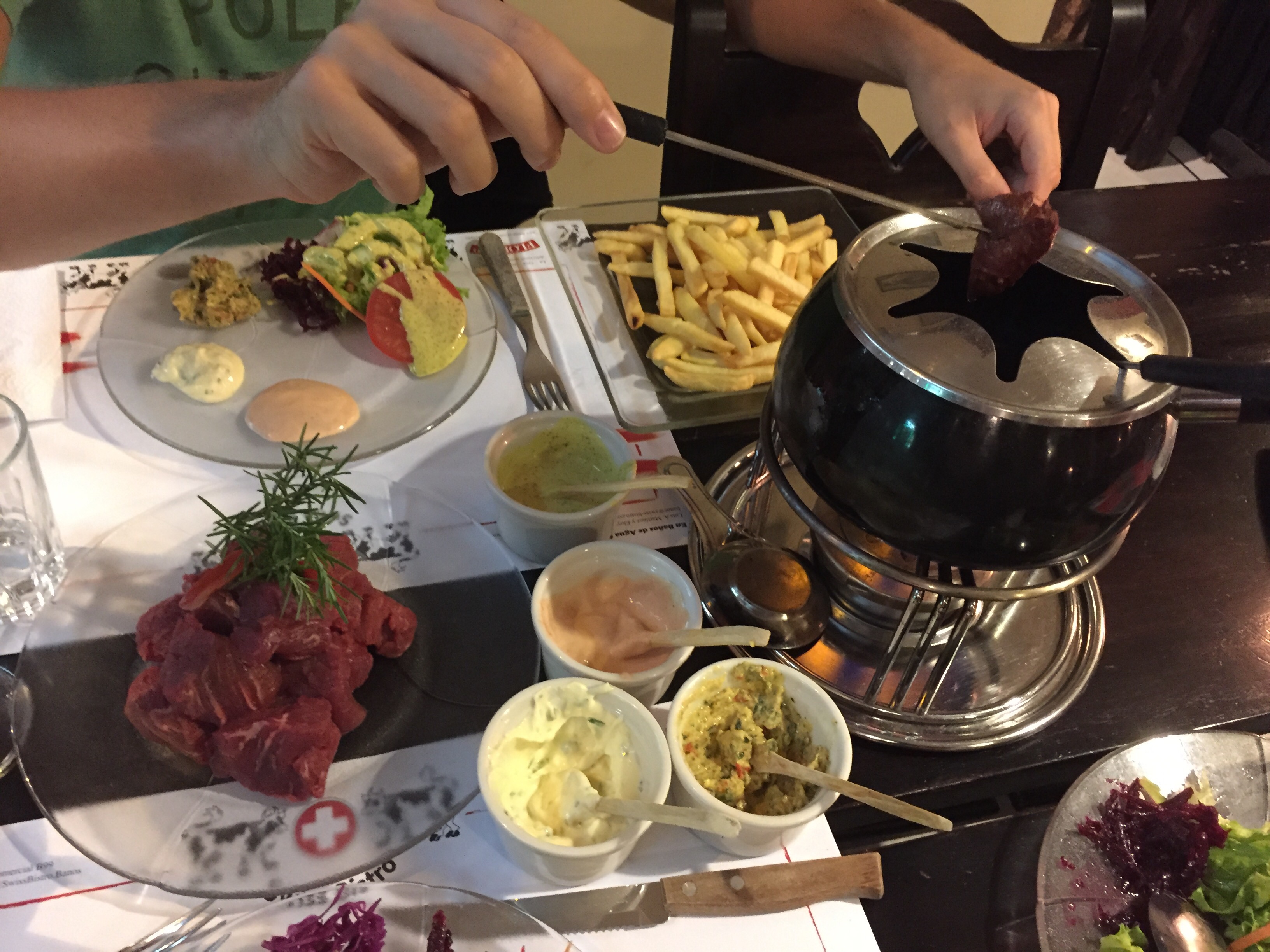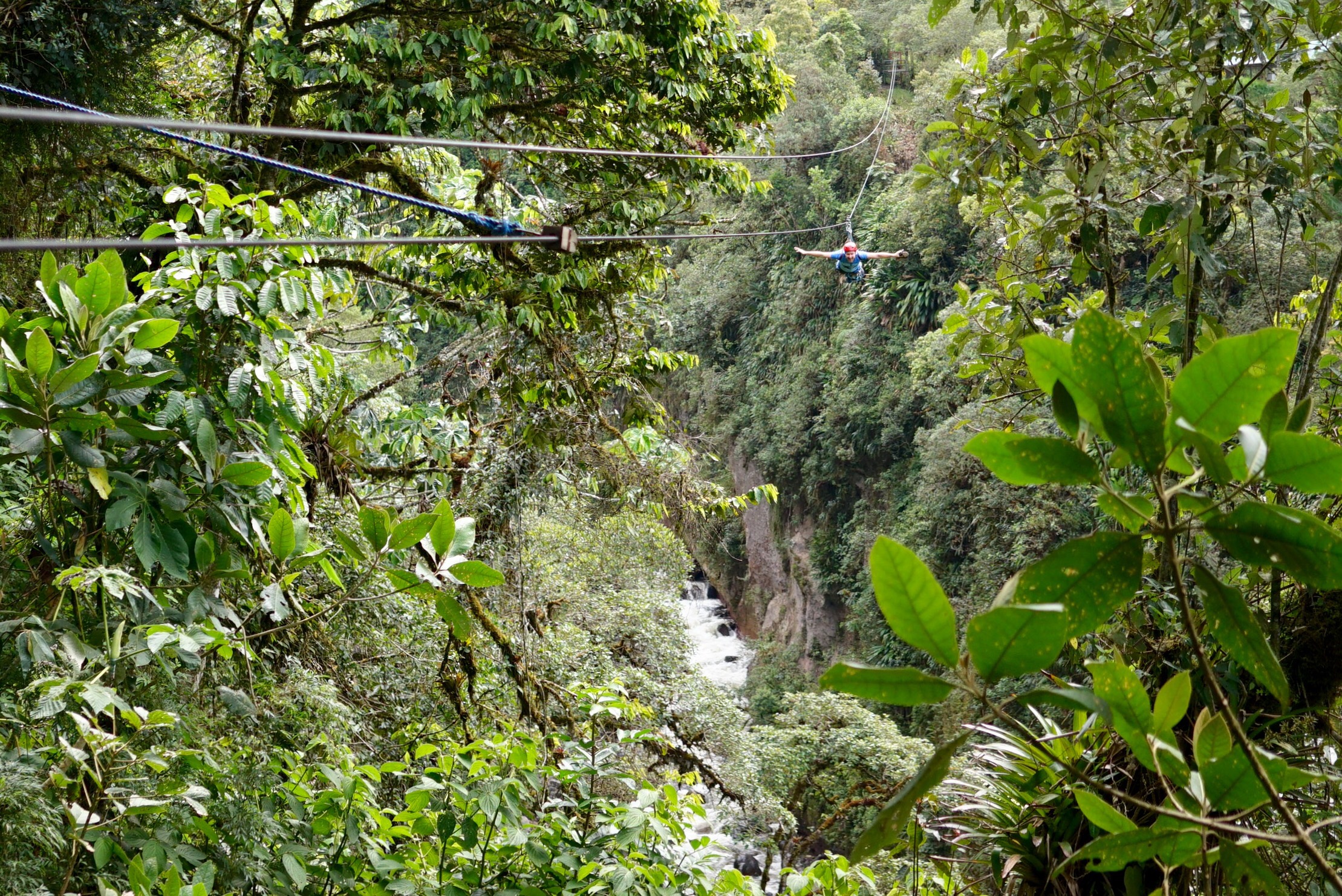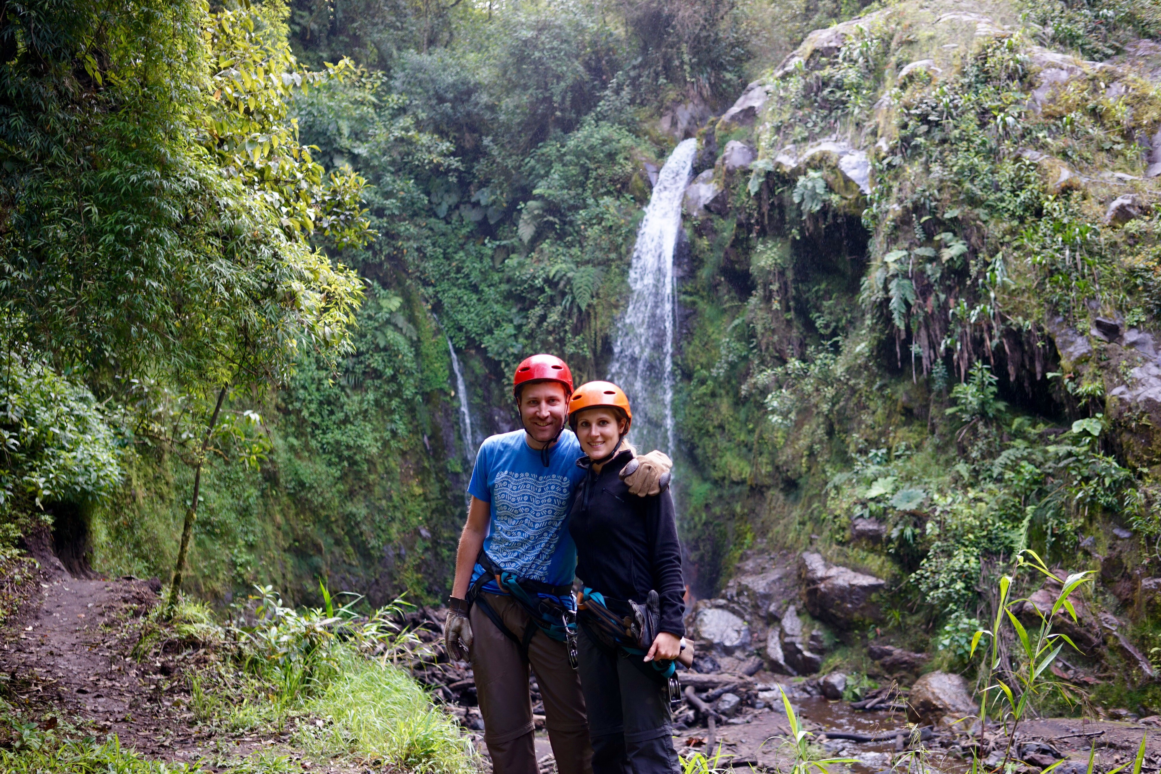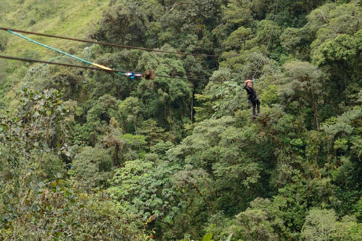 Mit Priscilla und Anita, den zwei bestens gelaunten Cousinen von Ann’s Töchtern, durften Steffi und Pauli ins Nachtleben von Quito eintauchen. Zur Musik einer dreiköpfigen Gitarrenband wurde eifrig getanzt und feurigheisser Canelazo getrunken. Die Busfahrt nach Baños am nächsten Tag konnte dementsprechend gut zum Relaxen genutzt werden. Denn in Baños, dem herzigen Städtchen gleich unterhalb des aktiven Vulkans Tungurahua, wird für die Touristen ziemlich gross angerührt. Neben Canyoning, Bungee-Jumping, Paragliding und Ziplining wird vor allem auch das kulinarische Angebot und das Nachtleben äusserst aktiv bewirtschaftet. Steffi und Pauli waren sehr angetan von der kulinarischen Vielfalt und genossen Festessen aus der peruanischen, italienischen, ecuadorianischen und sogar schweizerischen Küche. Besonders im Schweizer-Stübli wurde ihnen ganz warm ums Herz. Für Erwärmung war auch dank der Drinks vom ‚Stray Dog‘ oder des ‚Volcano‘ gesorgt. Dessen Wirkung war auch noch am nächsten Tag deutlich spürbar… Aber auch musikalisch wurde ganz viel geboten. Mit dem DJ der ‚Goodbar‘ und dessen musikalischen Leckerbissen steigerte sich Pauli’s Laune in luftige Höhen, fast bis zum Tungurahua. Steffi’s Aufmerksamkeit galt in erster Linie der Akrobatik. Mit ihren Darbietungen begeisterte sie die Menge. Die Weihnachtstage wurden anschliessend etwas ruhiger angegangen. Das farbenfrohe Blinken der tausenden Lichterketten und die unterschiedlichen Dekorationsarten der zahlreichen Christbäume sorgte für ausreichend Weihnachtsstimmung im angenehm milden Klima Baños. Der Besuch des Pailon de Diablo, des überaus wuchtigen Wasserfalls, liess den beiden nochmals die Kraft der Natur vor Augen führen. Kräftig schwitzten Steffi und Pauli schliesslich beim Anblick der Schlucht, über welche sie gemeinsam im Superman-Stil hinuntersausen konnten. Ein Wahnsinnsabenteuer, einfach nur chévere!!