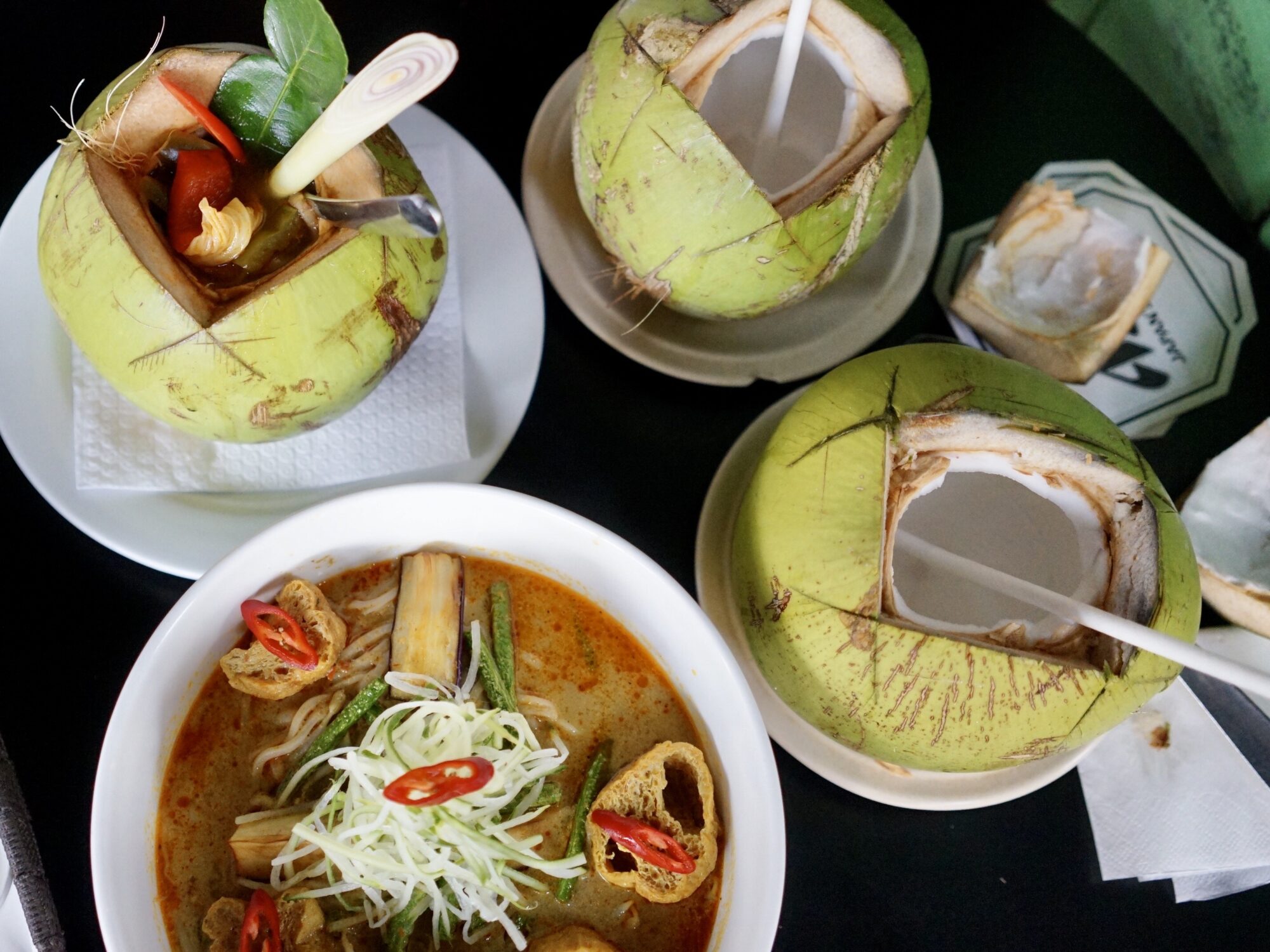 Tom Yam – die scharfe Suppe aus Thailand, gespickt mit Zitronengras und Chili, hier serviert in einer zuvor ausgehöhlten Kokosnuss.