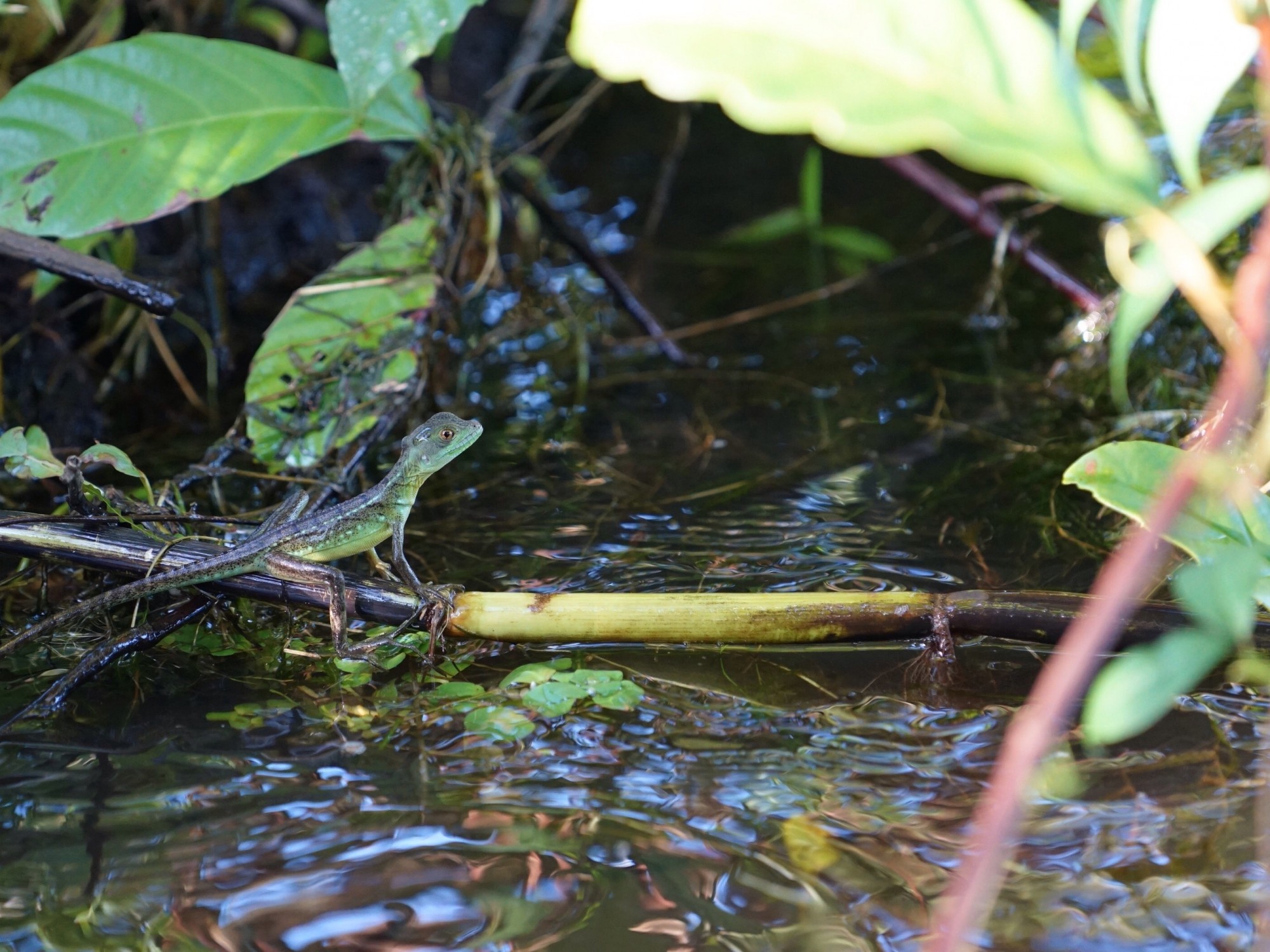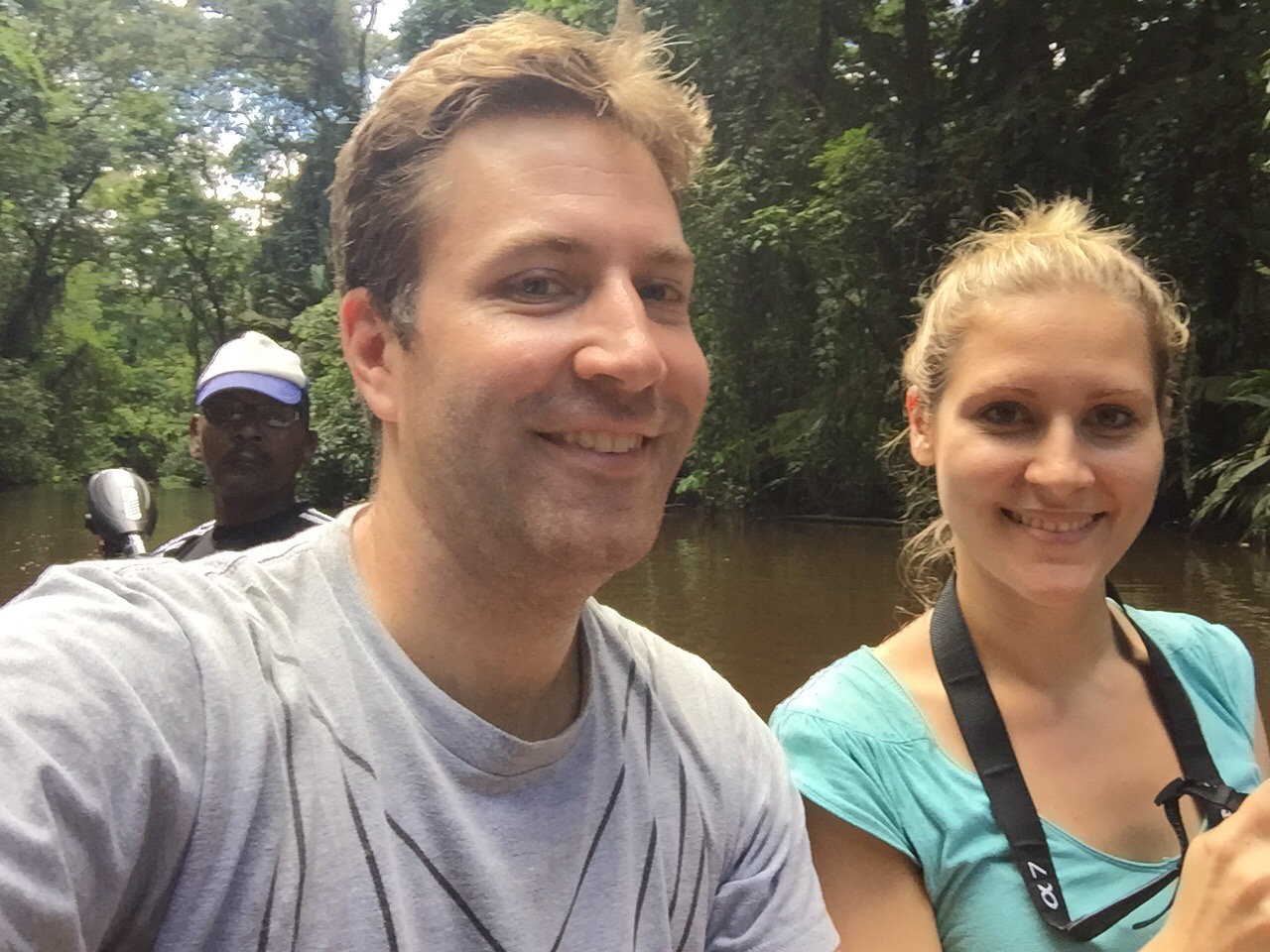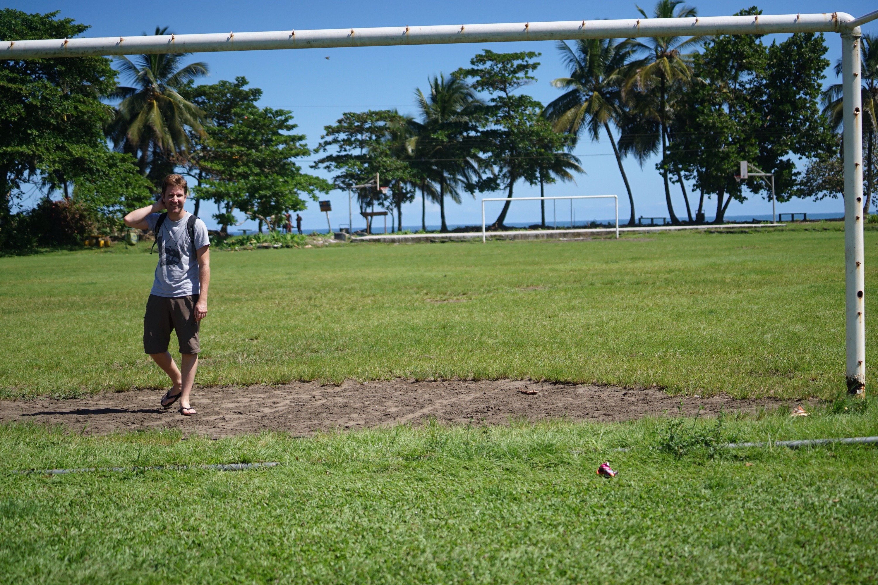 „I had the time of my life…“ Diesen Song summte Ever, der überaus freundliche Angestellte von unserer Bleibe namens Toucan & Tarpon, während er heftig in den Boxsack hämmerte. Zum gleich im Anschluss folgenden „My heart will go on“ stemmte er seine selbstgemachten Gewichte in die Höhe. Je höher er als Céline Dion die Stimme anhob, desto kräftiger schien Ever die gemeisselten Steinsformationen in die Höhe zu bewegen. Eine äusserst interessante Kombination, wie übrigens vieles hier im Tortuguero Nationalpark: Eine Mischung aus Ökotourismus und Schnellboot-Birdwatching-Touren. Pauli und Steffi wählten eine Kanu-Tour mit Castor Hunter Thomas, dem berühmt berüchtigten und im Lonely Planet hoch gelobten Tourguide. Mit seinem geschulten Auge entdeckte er alles was im Wasser lag, in den Bäumen hing oder in den Lüften segelte. Steffi fühlte sich mit ihrem Teleobjektiv wie im siebten Himmel und knipste enthusiastisch drauflos. Pauli verliebte sich in einen blauen, riesigen Schmetterling, welcher immer mal wieder vorbeiflog. So verging ein wunderschöner Morgen im paradiesischen Tortuguero.