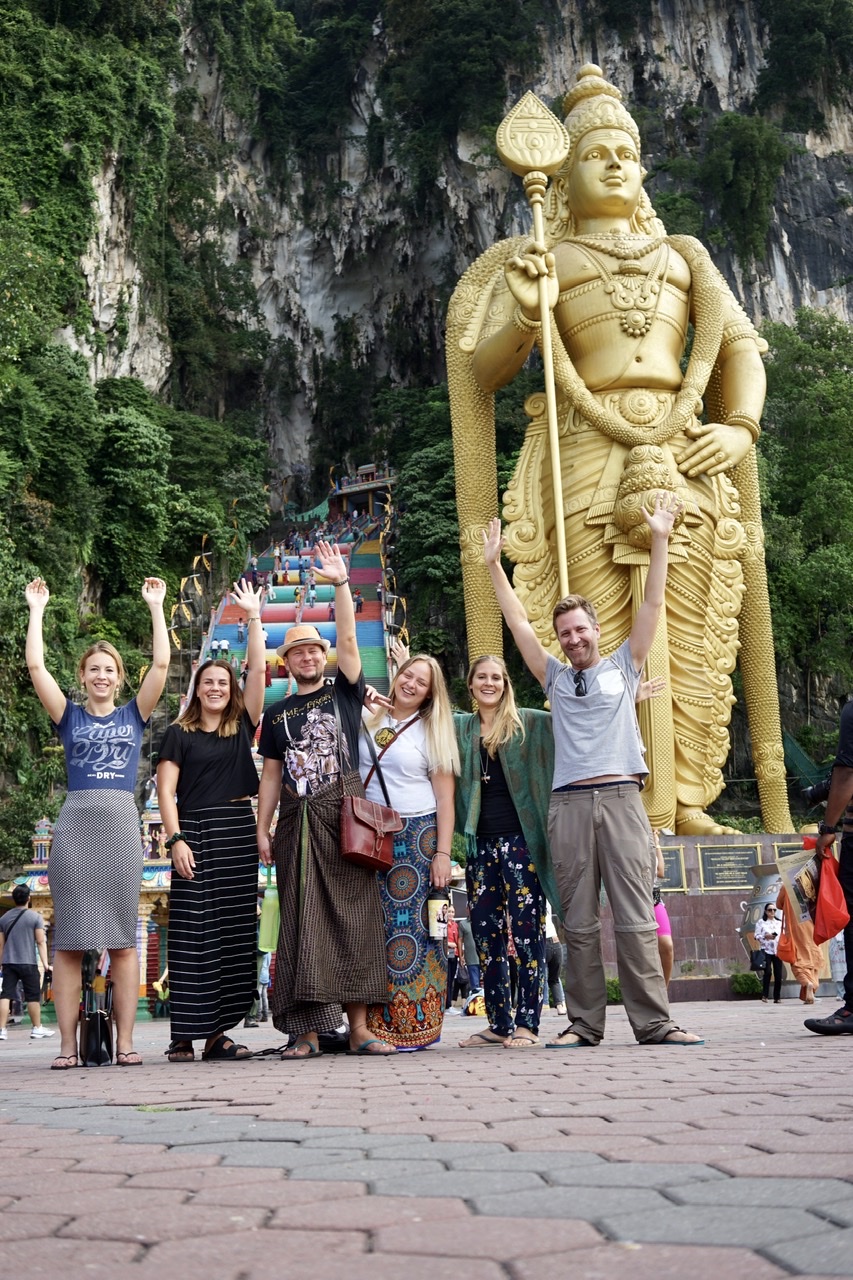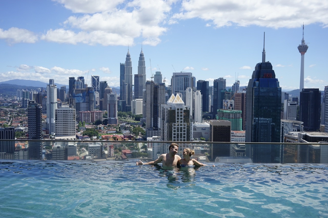 In KL, die Kurzform für Kuala Lumpur, erfahren die beiden auf der Zugstrecke vom Flughafen ins Stadtzentrum was es bedeutet, wenn die Klimaanlagen auf der höchsten Stufe die kühlstmögliche Temperatur in den Waggon blasen: Es herrscht Eiszeit bei knapp 35 Grad Aussentemperatur und 90 Prozent Luftfeuchtigkeit! Mit der sprichwörtlich coolsten Metro, eisgekühlte Aluminiumsitze inklusive😜 gehts weiter zum Hostel. Da kommt der lauwarme Infinitypool vom ,Penthouse on 34‘ den beiden gerade entgegen. Steffi & Pauli schweben beim Ausblick auf die Skyline von KL im siebten Himmel. Nicht nur den beiden Protagonisten ergeht es so, auch alle anderen Reiselustigen, welche sich im Pool tummeln, sind total begeistert. Menschen aus aller Welt treffen sich hier. So unternehmen Steffi & Pauli zusammen mit einem Päärli aus Litauen, einer Finnin und einem jungen Unternehmer aus Pakistan noch eine längere Stadterkundungstour. Schon am nächsten Tag gesellt sich zur illustren Gruppe eine weitere Schweizerin und ein Doktorand aus Zimbabwe dazu. Auch Deutsche, Holländer und sogar ein junger Architekt aus St. Martin lernen die beiden in den weiteren Tagen kennen. Steffi & Pauli stellen fest: In KL trifft sich die Welt.